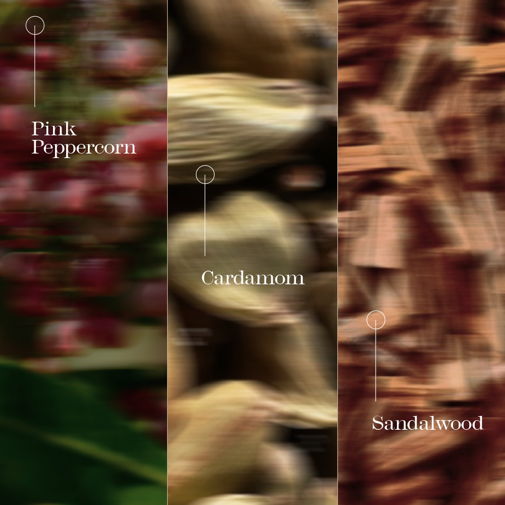The fragrance opens with a bright note of Rose, Lemon Myrtle, and Pink Peppercorn. Followed by a richer heart of Cardamom, Olibanum, and Cyclamen. Grounding Sandalwood, Musk, and Incense create a lasting finale that lingers on skin long into the night.